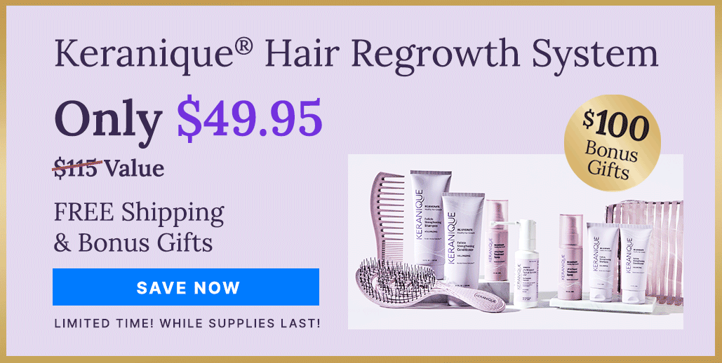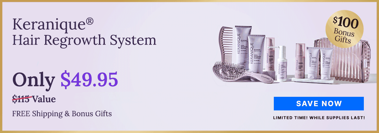 The Keranique Hair Regrowth System contains everything needed for thicker, fuller, healthier-looking hair. Salon-quality hair care meets science with these clinically-tested products that is formulated with Minoxidil, the only FDA-approved Topical Solution for Women's Hair Regrowth. Regrowing beautiful hair has never been easier!